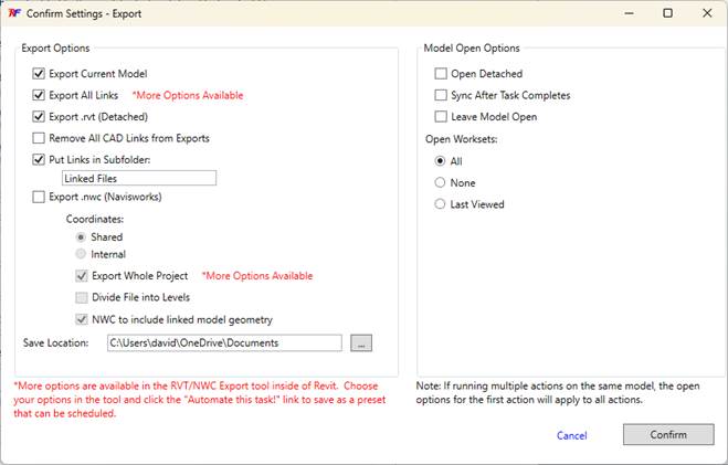 a. Important: Avoid using the “Open Detached” option when automating exports. This will put the model in a new and never-been-saved state which can affect model property data and link locations. This could result in missing links or other information in exports.