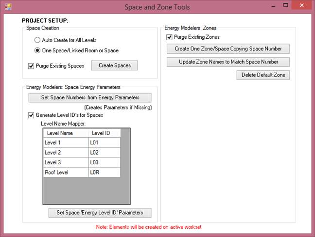 The Zone portion of this tool will create one zone per space for use in exporting to certain analysis applications. It creates three parameters “Energy Level ID”, “Energy Zone Type”, and “Energy Order Number” that can be concatenated to the space number parameter for exporting to Trane Trace. The Space number gets copied to the zone name for exporting to other energy modeling tools. The Parameter Transformer can be used to facilitate populating these parameters with meaningful data.