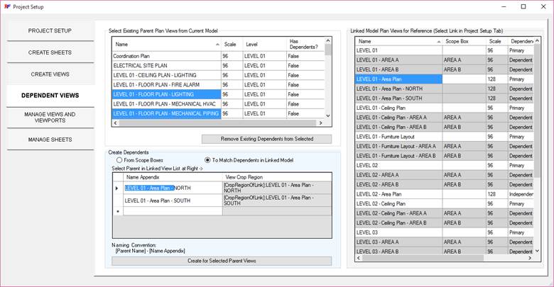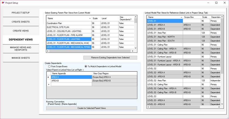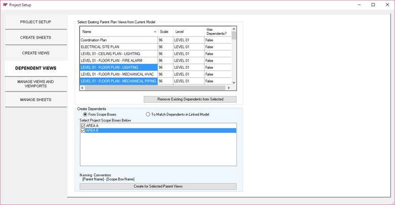 2. To create dependent views for multiple views, you just select the primary views at the top and the desired scope boxes. Then just click to create the dependent views.
